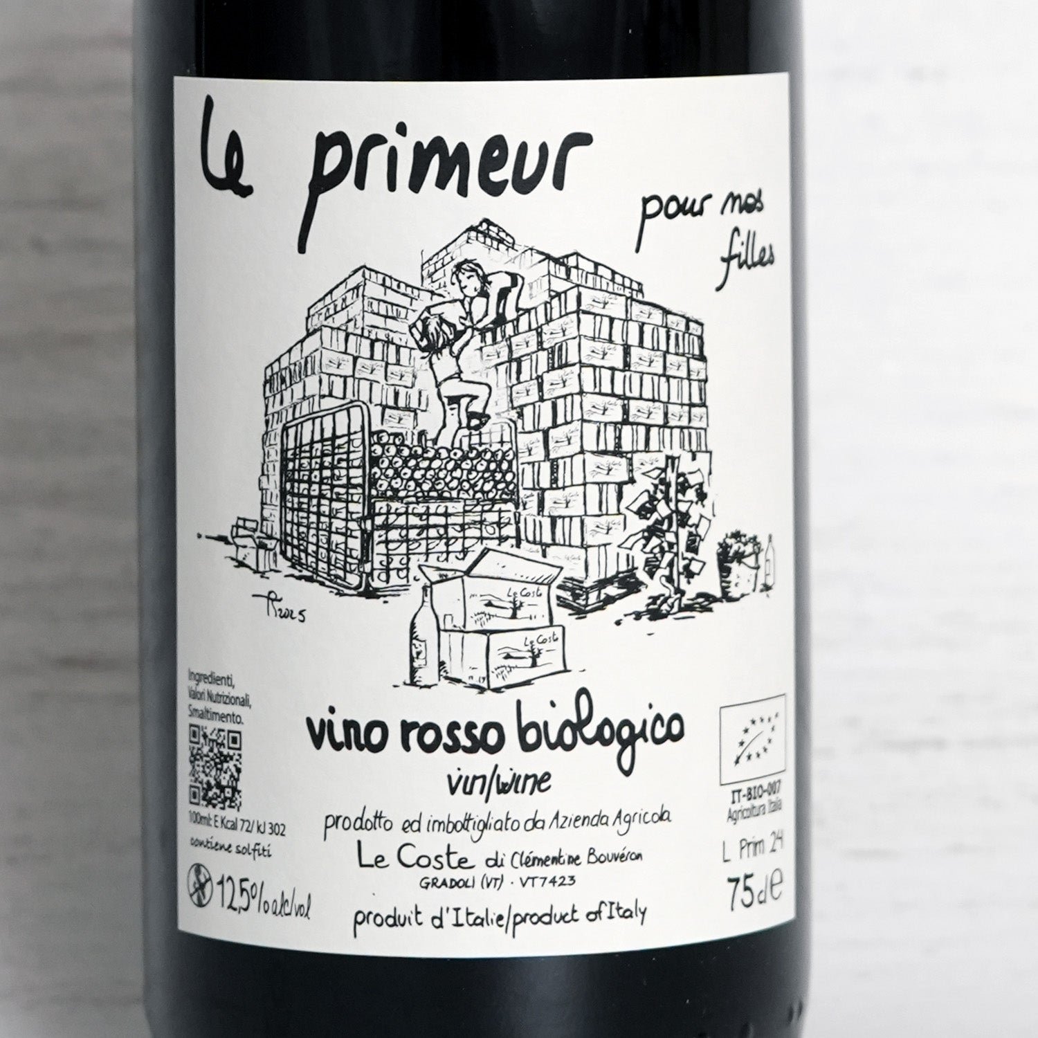 収穫したブドウは除梗せず、外気に触れないカーボニックマセレーションにて10日程度、圧搾後モストだけの状態で約1か月、醗酵が終わるのを待つ。2024年は収穫前の雨によってモストの量が増え、収穫量は多くなったものの、果実的な凝縮はあまり見られないアレアーティコ。それでもプリムールのような、飲み心地を意識したワインにとっては理想的なブドウ。フレッシュでいて香り高く、果実的でジューシーな口当たり。素晴らしい飲み心地と安心して開けられる味わい!