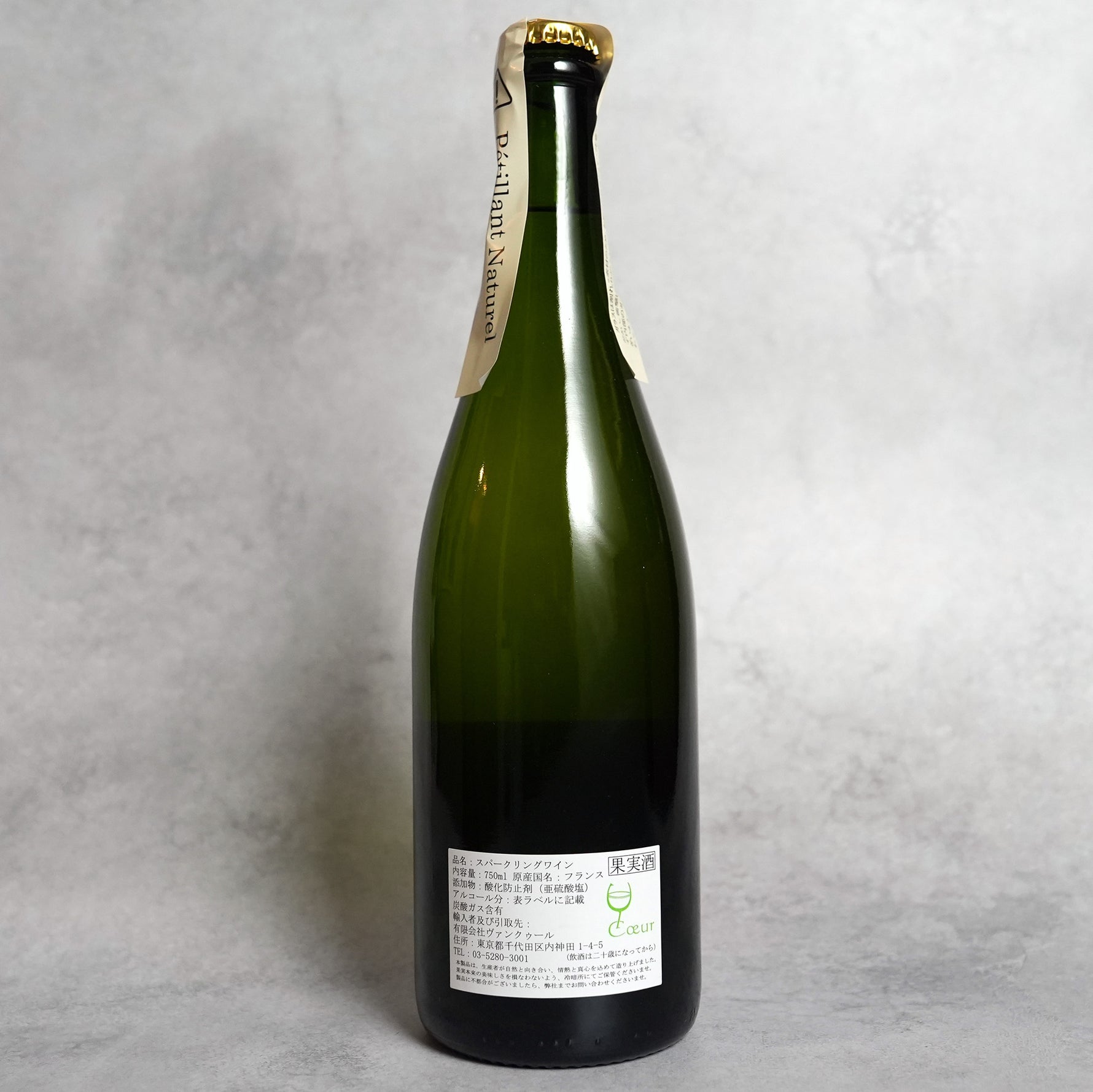 自然酵母で一次発酵を行い、瓶内二次発酵は20ヶ月以上。SO2無添加、ノンフィルターで仕上げるため旨味の層が厚い。2023年は9月19日収穫、収量は豊作の50hL/ha。瓶詰め機の故障により王冠キャップに変更されたが、ガス圧4.3気圧ながら澱由来の力強い泡を感じる。濁りのあるレモン色で、グレープフルーツを思わせるまろやかな柑橘と塩気あるミネラルが溶け込む爽快な仕上がり。