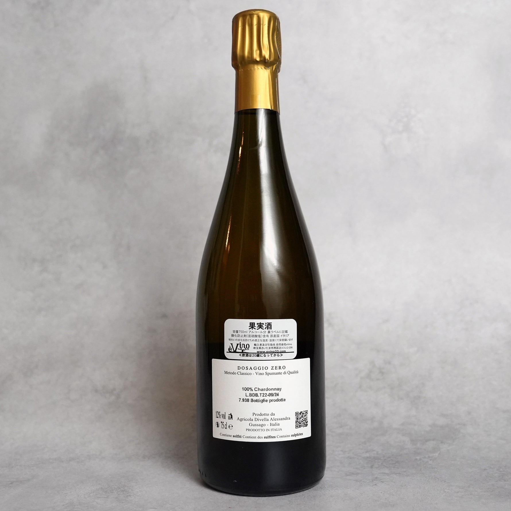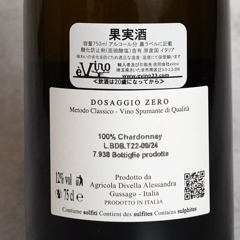 収穫後、除梗せず低圧力でプレス、セメントタンクにて醗酵。古バリックにて約9か月の熟成。全体の10%にあたるリザーヴワイン(3年以上バリックで熟成した、複数ヴィンテージをブレンド)、微量の糖分、酵母を加えて瓶内2次醗酵。そのまま24か月以上オリと共に熟成。オリ抜き(デゴルジュマン)は24年9月。ドサージュ(糖分、リキュール添加)を行わずSO2も添加しないスプマンテ。